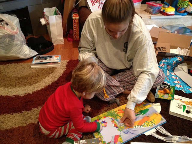 Christmas finally arrived after 25 days of counting down. (Each morning in December he would look at our little countdown Santa display and say "how many days til Christmas?" and yell "9!" or whatever.) Anyways, Jack came out in his reindeer PJs and was excited by all the presents under the tree and in his stocking. He eyed up his stocking suspiciously before he dove in.